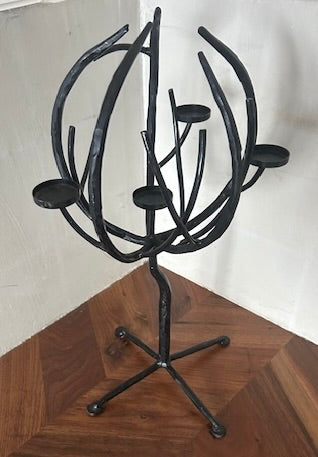 Det gick inte att ladda hämtningstillgänglighet   Denna exklusiva ljushållare i smide är ett sant konstverk, handtillverkad i Sverige med en passion för genuint hantverk och unik design. Med plats för fyra stearinljus skapar den en varm och inbjudande atmosfär i varje rum. Varje ljushållare är unik i sitt slag, där smedens skicklighet och kreativa vision tydligt framgår. Den distinkta designen bryter mot det traditionella och tillför en spännande dimension till din inredning. Materialet, robust smidesjärn, garanterar inte bara en imponerande tyngd och stabilitet utan också en hållbarhet som sträcker sig över generationer. Denna ljushållare är mer än bara en funktionell inredningsdetalj; den är ett samtalsobjekt som fångar blickar och sätter en personlig prägel på ditt hem. En perfekt present till den som uppskattar svensk design, kvalitet och hantverk, eller en tidlös investering för ditt eget hem.Ljushållare i Smide