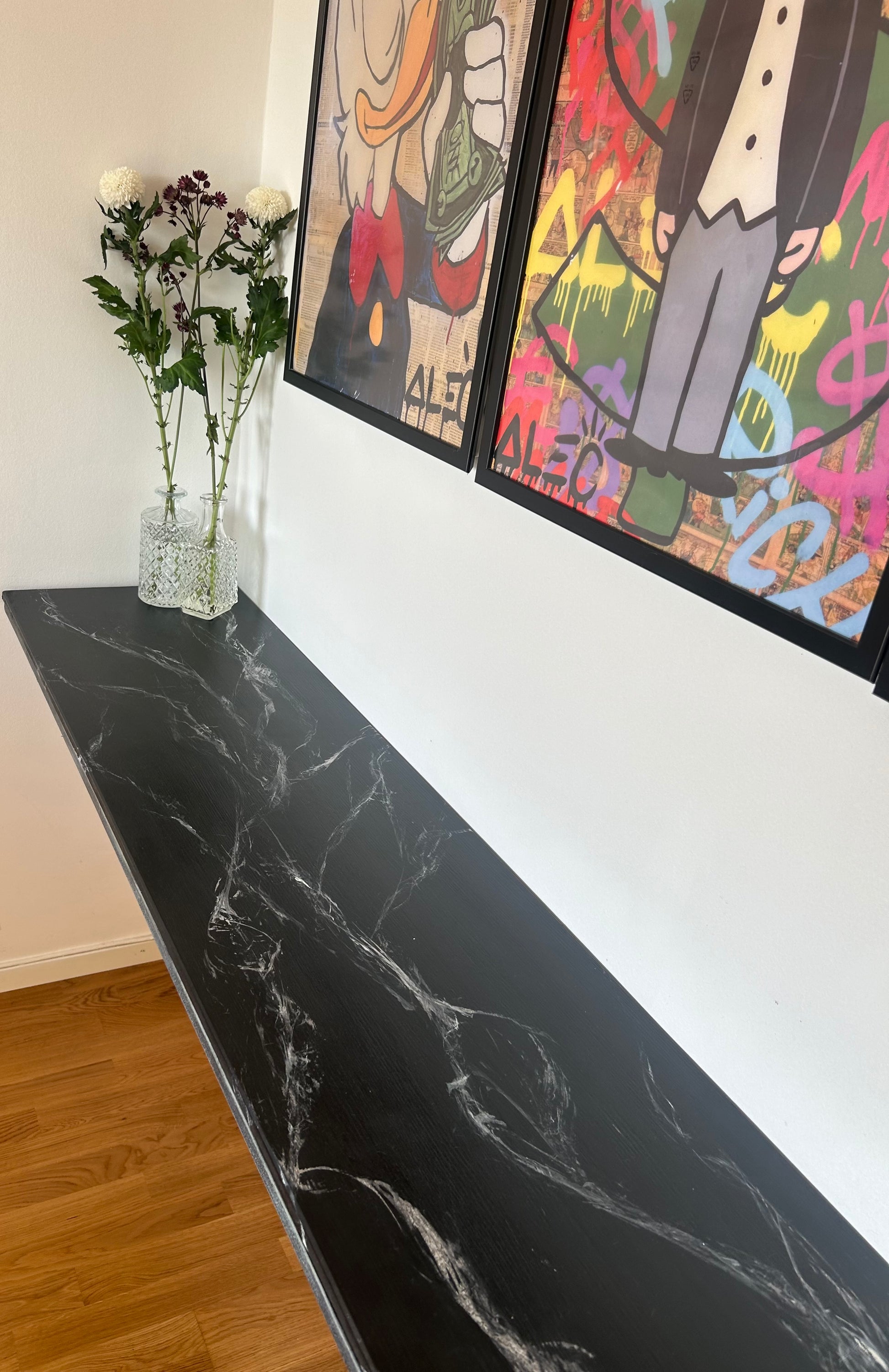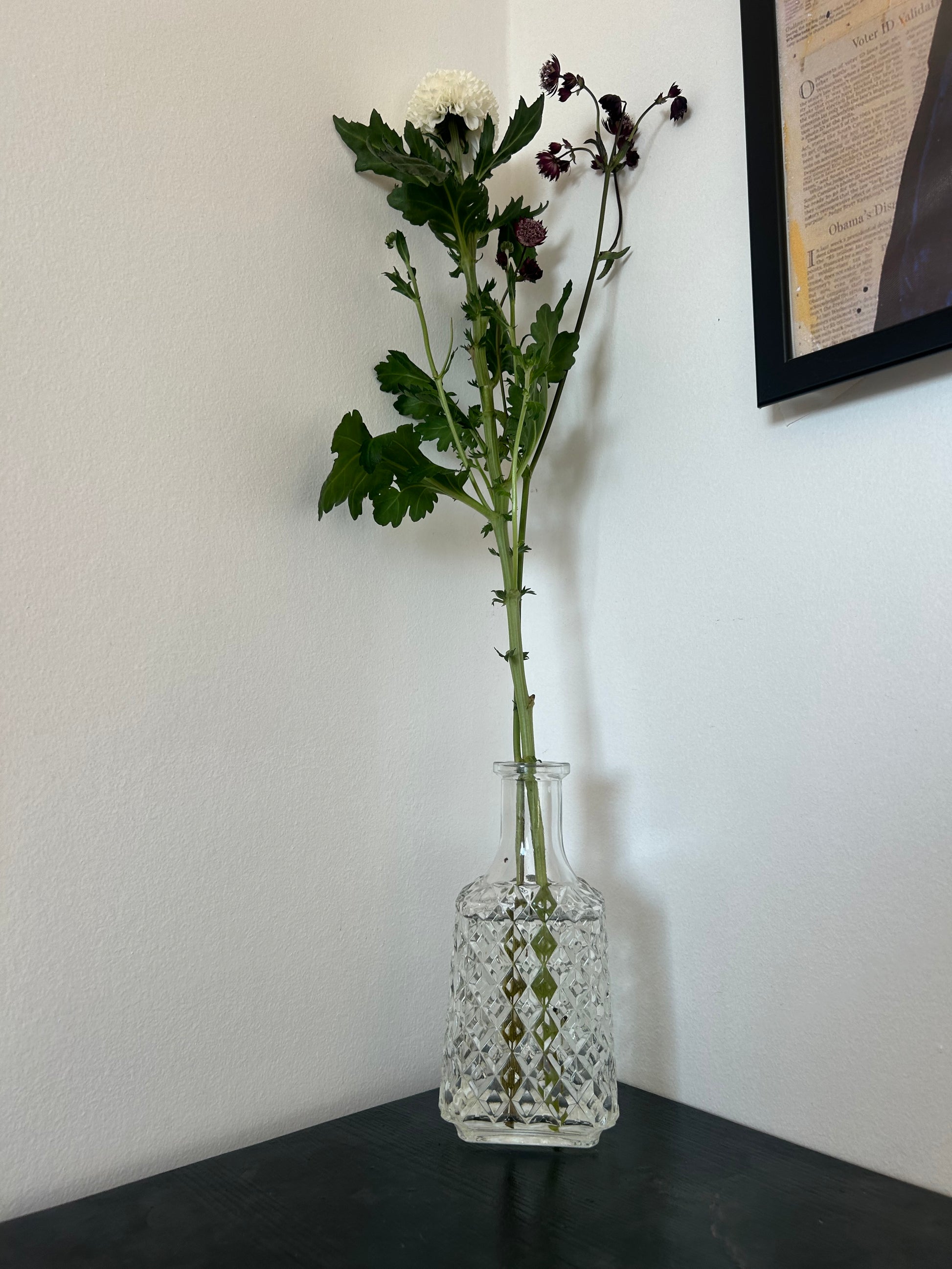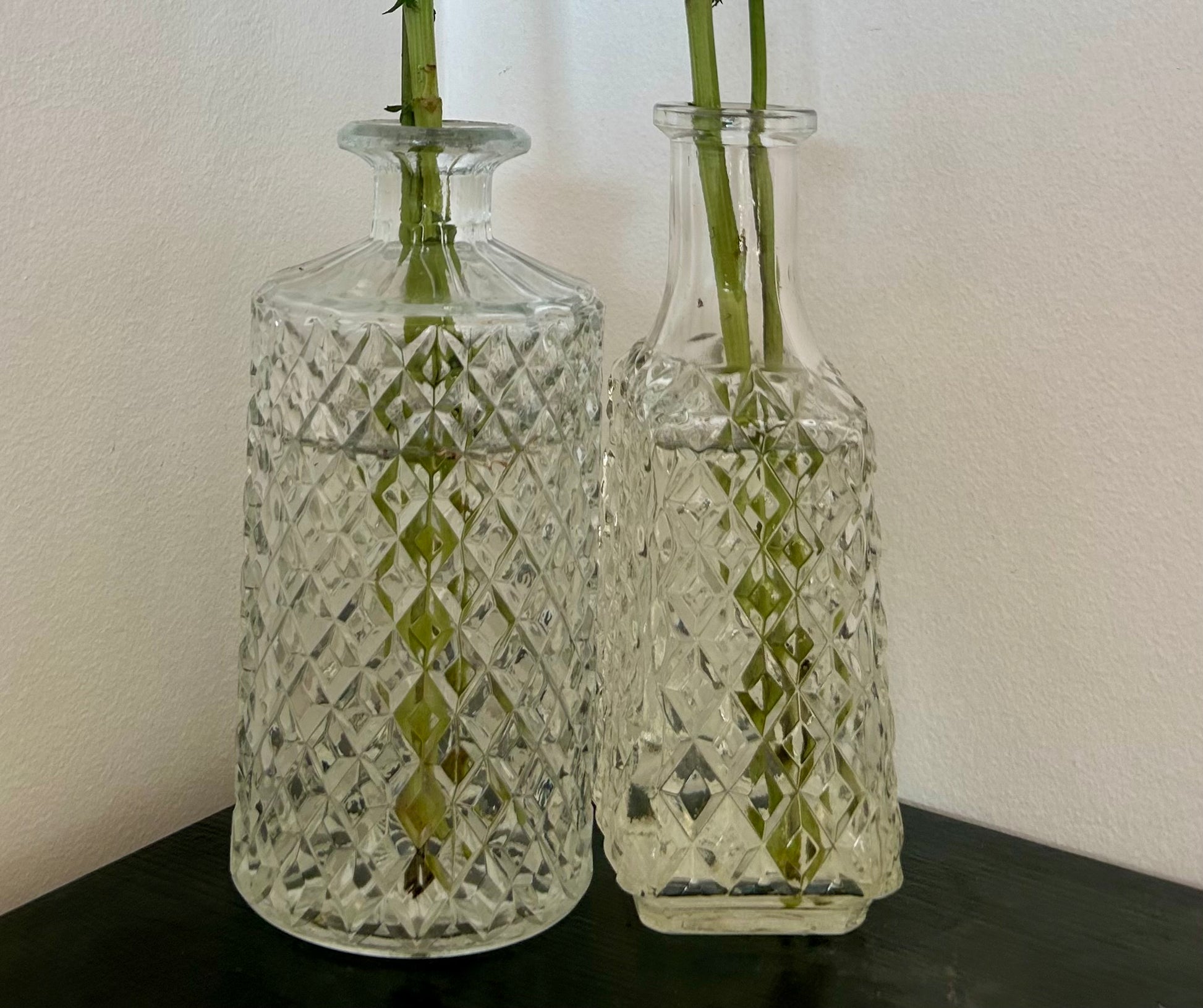 Det gick inte att ladda hämtningstillgänglighet Dessa eleganta glaskaraffer är inte bara perfekta för att servera drycker, utan fungerar också utmärkt som stilfulla vaser för små blombuketter. Deras smala hals och breda botten ger ett stabilt stöd som framhäver varje blomma, från en enkel kvist till en liten, frodig bukett. Den klassiska designen gör att de passar in i alla hemmiljöer, och de är lika vackra på ett dukat middagsbord som på en fönsterbräda eller ett sidobord. Ett perfekt sätt att addera en touch av grönska och färg i ditt hem.Två karaffer